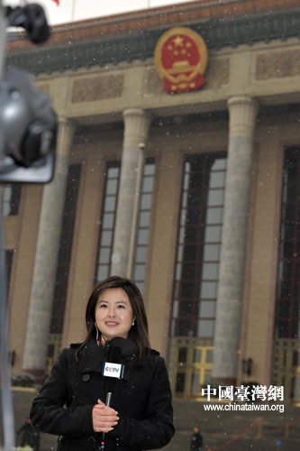中央電視臺記者張泉靈一大早就到了人民大會堂前做報道!。ㄖ袊_灣網(wǎng)發(fā) 肖春陽、劉洋攝)