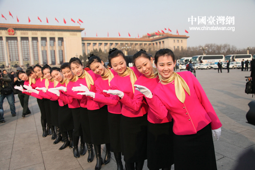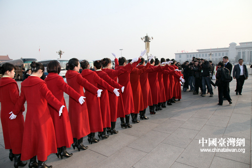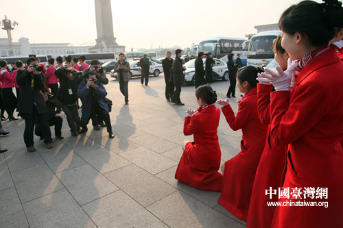 3月5日,十一屆人大四次會議在人民大會堂開幕。天安門廣場大會工作人員受到了記者的關注。各種造型的女服務員讓攝影記者不停地按下手中的快門。肖春陽、劉洋攝影報道