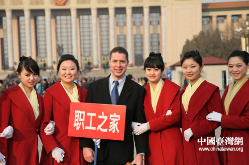 3月5日,十一屆人大四次會議在人民大會堂開幕。天安門廣場大會工作人員受到了記者的關注。.陽光燦爛的笑容。肖春陽、劉洋攝影報道