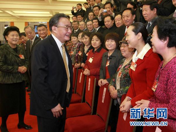 3月8日,中共中央政治局常委、全國人大常委會委員長吳邦國參加十一屆全國人大四次會議河北代表團(tuán)的審議。這是吳邦國同女代表親切交談,向她們致以節(jié)日的祝賀。新華社記者 龐興雷攝