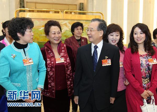 3月8日,中共中央政治局常委、國(guó)務(wù)院總理溫家寶參加十一屆全國(guó)人大四次會(huì)議吉林代表團(tuán)審議。會(huì)前,溫家寶與女代表親切交談,向她們致以節(jié)日祝賀。新華社記者鞠鵬攝