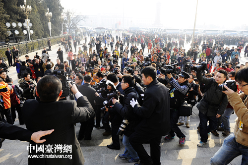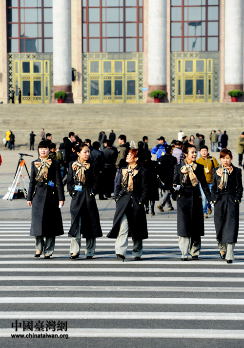 兩會期間,人民大會堂外,當(dāng)記者們爭相追逐采訪拍攝代表、委員及 “美女”保障人員時,有一個默默無聞工作的群體------兩會清潔工。 (中國臺灣網(wǎng) 發(fā))