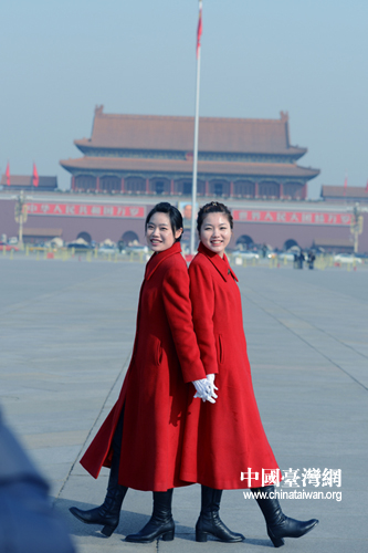 天安門廣場上著“紅色”盛裝的美麗女工作人員。