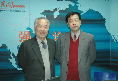 2005年1月5日,中國國際問題研究所研究員郭震遠(yuǎn)(左),北京大學(xué)國際關(guān)系學(xué)院國際政治系主任李義虎(右)接受媒體訪談,回顧和分析2005年兩岸關(guān)系中的熱點(diǎn)。(圖片來源:人民網(wǎng))