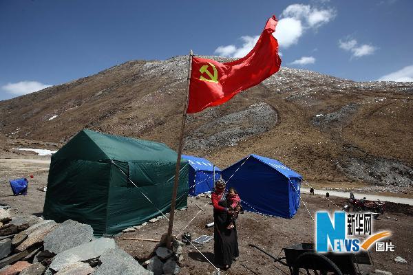 當(dāng)日,記者從青海玉樹縣結(jié)古鎮(zhèn)前往隆寶鎮(zhèn)采訪,一路上發(fā)現(xiàn),無論是在路邊的災(zāi)區(qū)群眾安置點還是深山草甸,都能看到飄揚(yáng)的五星紅旗和黨旗,看到解放軍和武警戰(zhàn)士們忙碌的綠色身影,看到政府發(fā)放的藍(lán)色帳篷。在無情的地震過后,在廢墟和藍(lán)天白云之間,紅色、綠色和藍(lán)色總能讓人心頭涌起一股暖流。新華社記者 費(fèi)茂華攝