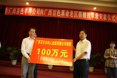 人民網(wǎng)百色3月31日電 (記者龐革平、謝建偉)3月31日下午,香港中國(guó)海外集團(tuán)有限公司和廣西百色豐林人造板有限公司分別向廣西百色災(zāi)區(qū)捐款100萬(wàn)元。此前,上海浦東發(fā)展銀行股份有限公司已向百色市捐款50萬(wàn)元,百色軍分區(qū)及所屬部隊(duì)官兵則為百色市捐款10.29萬(wàn)元。
