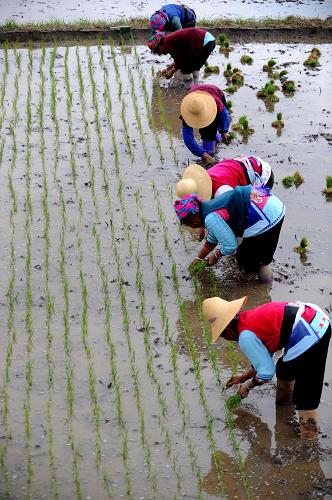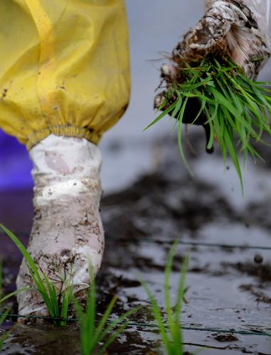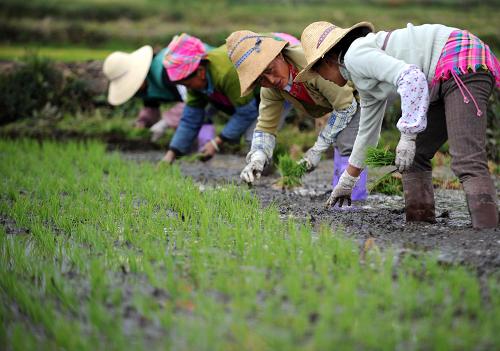 4月28日,大理市喜洲鎮(zhèn)的村民正在插秧。春耕時(shí)節(jié),遭遇嚴(yán)重旱情的云南省全力做好抗旱保春耕工作,各地及時(shí)調(diào)整種植結(jié)構(gòu),并抓好農(nóng)作物的田間管理。近期,少量的降雨使大理白族自治州部分地區(qū)旱情得到一定緩解,當(dāng)?shù)厝罕娮プ∮欣麜r(shí)機(jī)搶插秧苗。新華社記者 秦晴 攝