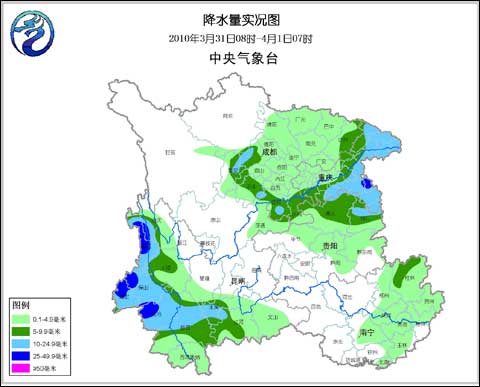西南地區(qū)降水量實況圖(2010年3月31日08時-4月1日07時)