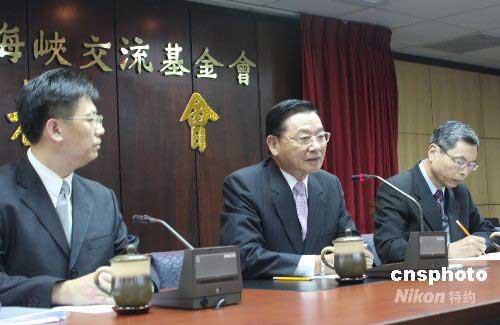 海協(xié)會(huì)與;鶗(huì)即將恢復(fù)協(xié)商會(huì)談。六月十日中午,海峽交流基金會(huì)董事長江丙坤(中)、副董事長兼秘書長高孔廉(右一),在海基會(huì)十七樓第一會(huì)議室舉行赴北京商談前的特別記者會(huì)。六月十一日,江丙坤將率代表團(tuán)赴北京。 江丙坤說:“明天,我們開始進(jìn)行的是一項(xiàng)舉世矚目的活動(dòng),大家都在寫歷史!敝行律绨l(fā) 耿軍 攝
