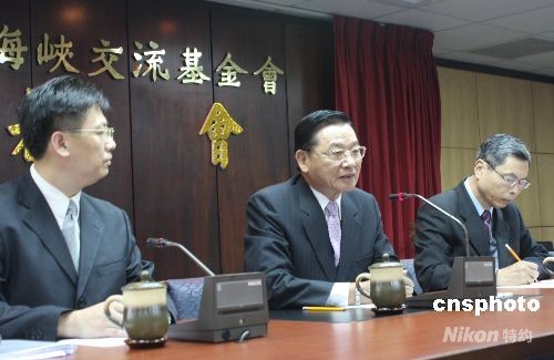 海協(xié)會與;鶗磳⒒謴(fù)協(xié)商會談。六月十日中午,海峽交流基金會董事長江丙坤(中)、副董事長兼秘書長高孔廉(右一),在海基會十七樓第一會議室舉行赴北京商談前的特別記者會。六月十一日,江丙坤將率代表團(tuán)赴北京。 江丙坤說:“明天,我們開始進(jìn)行的是一項舉世矚目的活動,大家都在寫歷史。” 中新社發(fā) 耿軍 攝