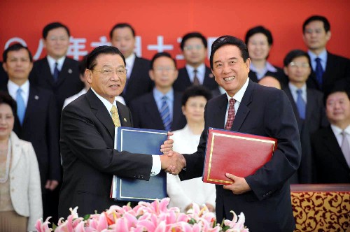 資料圖片:6月13日9時(shí)許,海協(xié)會(huì)與;鶗(huì)在北京就兩岸周末包機(jī)與大陸居民赴臺(tái)旅游簽署協(xié)議。這是海協(xié)會(huì)會(huì)長(zhǎng)陳云林和;鶗(huì)董事長(zhǎng)江丙坤在簽字儀式上握手。 新華社記者李曉果攝