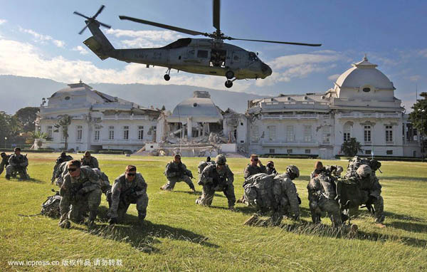 海地首都太子港,在被地震嚴(yán)重?fù)p毀的海地總統(tǒng)府前的草坪上,美國三二五空降步兵團(tuán)的一些士兵正蹲在地上躲避直升飛機(jī)螺旋槳造成的渦流。