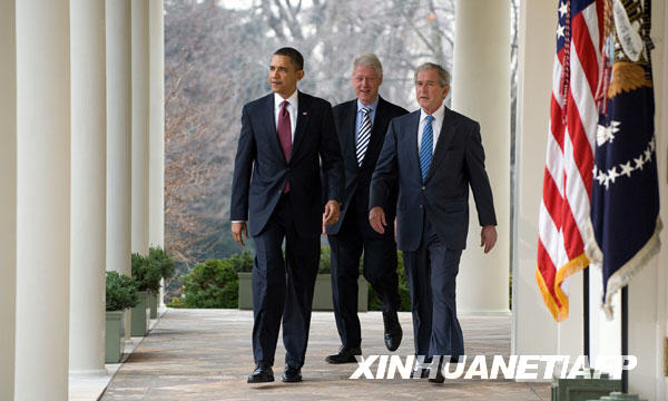 1月16日,美國(guó)總統(tǒng)奧巴馬(左)和兩位前總統(tǒng)克林頓(中)、小布什(右)在白宮出席新聞發(fā)布會(huì)。新華社/法新