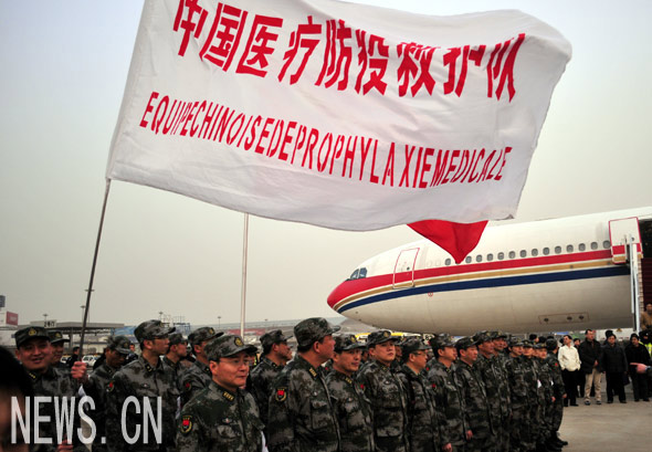 這支由40人組成的醫(yī)療防疫救護(hù)隊(duì),是中國(guó)政府根據(jù)聯(lián)合國(guó)人道主義援助協(xié)調(diào)辦公室的要求,從解放軍總部機(jī)關(guān)、南京軍區(qū)總醫(yī)院、軍事醫(yī)學(xué)科學(xué)院、解放軍第二軍醫(yī)大學(xué)和第302醫(yī)院等單位抽選組成,其中絕大部分是中青年技術(shù)骨干,90%掌握一門(mén)外語(yǔ),70%參加過(guò)國(guó)際維和任務(wù),并有參加四川汶川特大地震救援的經(jīng)驗(yàn)。醫(yī)療防疫救護(hù)隊(duì)攜帶了手術(shù)、急救、診療、檢查、消毒和生活保障等裝備和必要藥品。他們到達(dá)災(zāi)區(qū)后,將開(kāi)展現(xiàn)場(chǎng)應(yīng)急醫(yī)學(xué)救援、醫(yī)療巡診、衛(wèi)生防疫等工作,并視情協(xié)助當(dāng)?shù)蒯t(yī)療機(jī)構(gòu)開(kāi)展醫(yī)療救治、恢復(fù)醫(yī)療機(jī)構(gòu)功能。