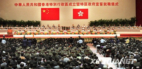 1997年7月1日0時0分0秒,中國政府恢復對香港行使主權。這是當日凌晨,中華人民共和國香港特別行政區(qū)成立暨特區(qū)政府宣誓就職儀式在香港會議展覽中心新翼七樓隆重舉行。新華社發(fā)