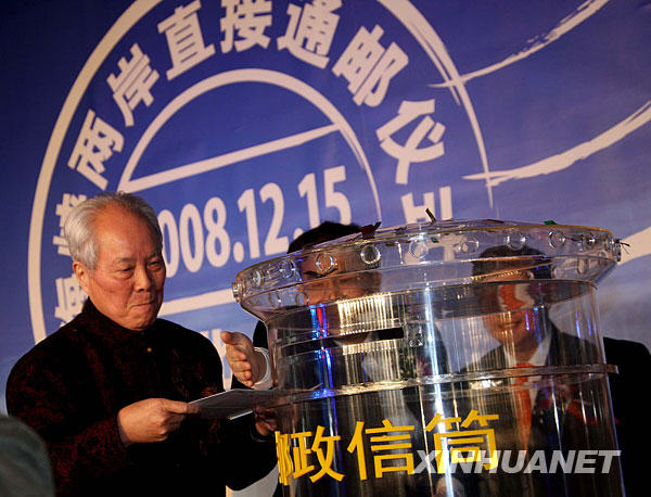 2008年12月15日,出生在臺灣的鄭堅老先生在北京舉行的兩岸直接通郵儀式上投寄出寄往臺灣的家書。當日,眾望所歸的兩岸海運直航、空運直航以及直接通郵正式啟動,兩岸同胞魂牽夢縈的直接“三通”得以基本實現(xiàn)。新華社發(fā)
