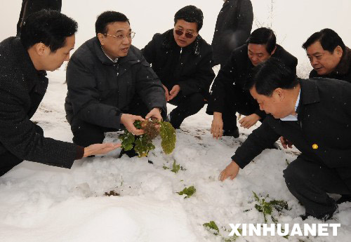 這場(chǎng)罕見(jiàn)的雨雪使農(nóng)作物受損嚴(yán)重。在達(dá)州宣漢縣、巴中通江縣、廣安鄰水縣等地,李克強(qiáng)冒雪深入農(nóng)田、菜地,心情沉重地察看農(nóng)作物和蔬菜受災(zāi)情況。他到貧困戶家中摸糧缸看水缸,并和當(dāng)?shù)馗刹楷F(xiàn)場(chǎng)商討恢復(fù)生產(chǎn)問(wèn)題,強(qiáng)調(diào)要及早謀劃,做好生產(chǎn)自救的各項(xiàng)準(zhǔn)備,并適時(shí)進(jìn)行結(jié)構(gòu)調(diào)整。