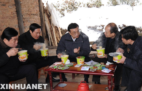 這是1月31日,李克強(qiáng)乘坐裝有防滑鏈的汽車在崎嶇覆冰的山路上行進(jìn)3個(gè)小時(shí),來(lái)到川北山區(qū)宣漢縣老君鄉(xiāng)紫云村。在察看災(zāi)情、慰問(wèn)群眾后,就和隨行陪同的領(lǐng)導(dǎo)一起邊用餐邊研究救災(zāi)工作。飯后,又繼續(xù)驅(qū)車到下一個(gè)村子慰問(wèn)。 新華社記者 李學(xué)仁 攝