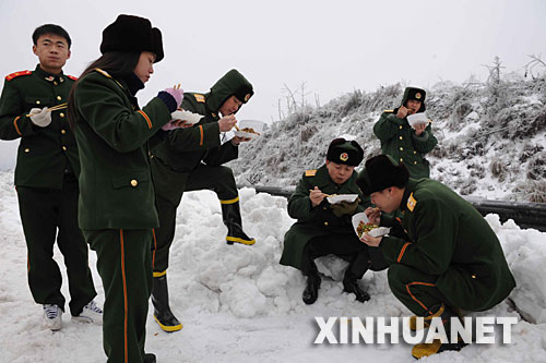 2月2日,湖南消防總隊(duì)郴州消防支隊(duì)的官兵在京珠高速公路堵車現(xiàn)場(chǎng)吃午飯。  新華社記者 陳樹根 攝