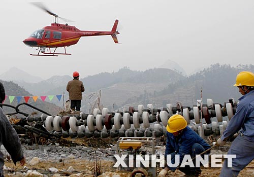 2月17日,一架直升機在廣東省樂昌市云巖鎮(zhèn)對遭受冰雪災(zāi)害的±500千伏江城輸電線路的災(zāi)后重建情況進行巡查。江城輸電線路的鐵塔多位于深山老林中,那里的積雪覆冰尚未融化,人工巡查的難度很大。連日來,國家電網(wǎng)公司啟用直升機對江城輸電線路所處的高山區(qū)域進行巡查,并用機載設(shè)備進行拍攝,及時發(fā)現(xiàn)故障和隱患,為全面恢復(fù)供電提供資料。