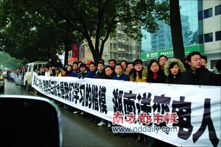 昨日,數(shù)萬市民自發(fā)地從四面八方匯集到羅海文、羅長明、周景華三位烈士靈車經(jīng)過的路上,懷著萬分悲痛的心情向三位英雄作最后的道別。