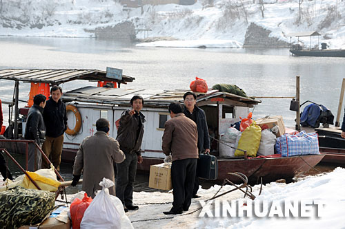 1月31日,返鄉(xiāng)人員乘渡船回家。 地處大別山區(qū)的安徽霍山縣自1月12日起遭受50年一遇的特大雪災(zāi),山路不通導致許多山區(qū)群眾返鄉(xiāng)和出行受阻。當?shù)卣诖_保安全的情況下,利用佛子嶺水庫的有利條件加強水路客運,臨時增調(diào)十幾條旅游船充當客運船,目前共20多條客運船只日均運輸客流1000人左右。當?shù)卣拖嚓P(guān)部門采取24小時安全監(jiān)控等多項措施確保乘客安全。
