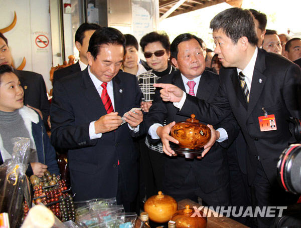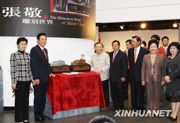 12月23日,海協(xié)會(huì)會(huì)長(zhǎng)陳云林(左二)在參觀木雕作品后與雕刻大師張敬互換紀(jì)念品。