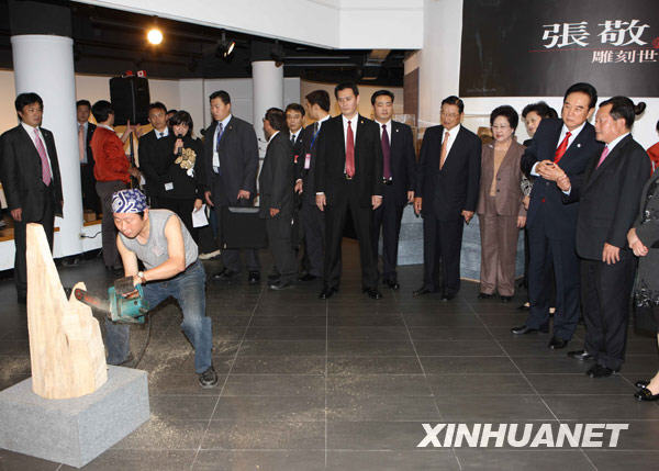 當(dāng)日,剛剛結(jié)束兩會(huì)第四次領(lǐng)導(dǎo)人會(huì)談的海協(xié)會(huì)會(huì)長(zhǎng)陳云林在;鶗(huì)董事長(zhǎng)江丙坤的陪同下,在苗栗縣參觀三義木雕博物館。新華社記者 袁滿 攝