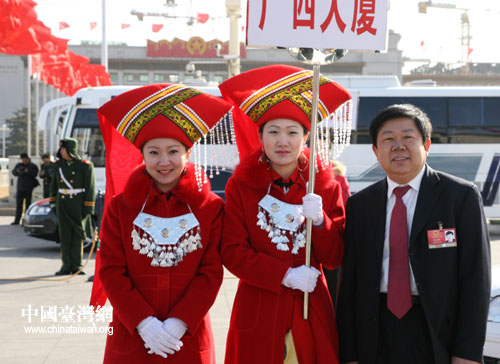 身著民族服裝的禮儀小姐與人大代表合影。