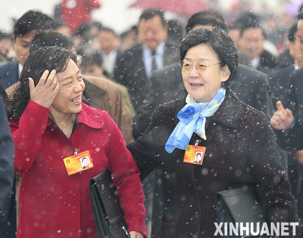 3月8日是國際勞動婦女節(jié),一場春雪降臨京城,女代表們冒雪前往北京人民大會堂,參加十一屆全國人大三次會議第二次全體會議,在工作中度過自己的節(jié)日。