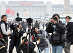 來自美聯(lián)社的記者在人民大會堂前支起了腳架,一人控制三臺相機不停拍攝,引起同行關注。(中國臺灣網(wǎng)發(fā) 肖春陽、劉洋攝)