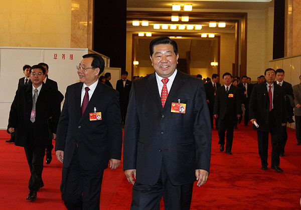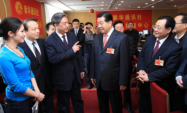 3月13日,中共中央政治局常委、全國政協(xié)主席賈慶林親切看望新華社兩會前方報道人員。新華社記者 龐興雷 攝