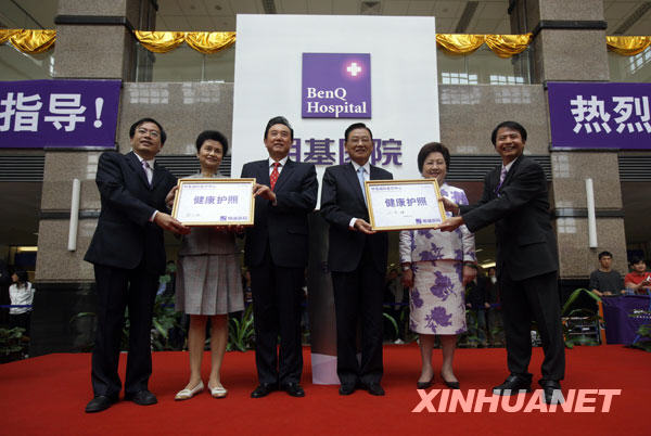 4月27日,陳云林(左三)、江丙坤(右三)等在南京明基醫(yī)院參觀時,展示醫(yī)院向他們贈送的健康護照。