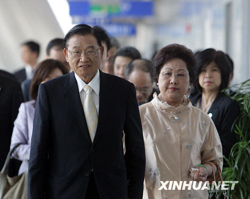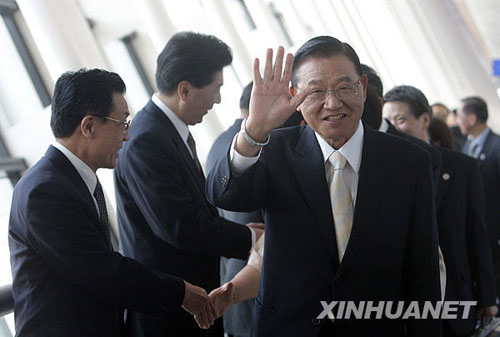 4月29日,江丙坤向送行人們揮手致意。新華社記者邢廣利 攝 |