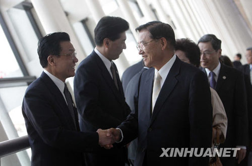 4月29日,江丙坤(右)與前來(lái)送行的海協(xié)會(huì)駐會(huì)副會(huì)長(zhǎng)李炳才握手道別。新華社記者邢廣利 攝