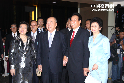 中國國民黨主席吳伯雄5日晚在臺北市晶華酒店設(shè)宴歡迎海協(xié)會協(xié)商代表團(tuán)陳云林一行。島內(nèi)眾多政商名流出席了晚宴。