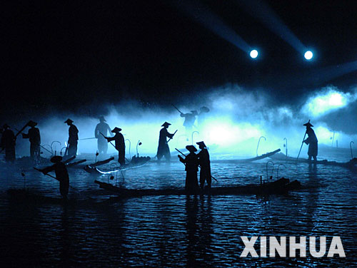 5月3日晚,在廣西桂林市陽(yáng)朔縣,演員們正在演出《印象·劉三姐》。 “五一”黃金周期間,大型山水實(shí)景劇《印象·劉三姐》演出由原來(lái)的每天一場(chǎng)改為兩場(chǎng)仍是場(chǎng)場(chǎng)爆滿(mǎn)!队∠蟆⑷恪氛诔蔀楣鹆致糜涡旅。 新華社記者 周華 攝