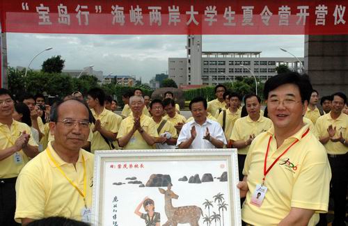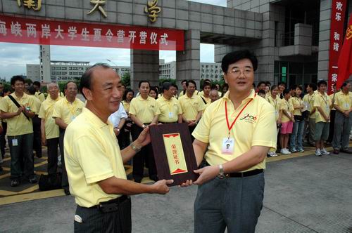 2006年7月,在2006“寶島行”海峽兩岸大學生夏令營開營儀式上,海南省臺辦主任徐剛向臺灣南榮技術學院院長葉茂榮教授贈送紀念品。(圖片來源:中國新聞網)