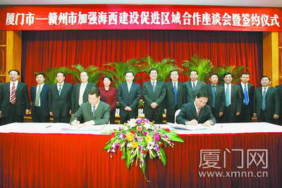 兩市舉行了加強海西建設促進區(qū)域合作座談會,廈門市委副書記、市長劉賜貴和贛州市委副書記、市長蔡曉明分別介紹了兩市的經(jīng)濟社會發(fā)展情況,福建省發(fā)改委副主任鄭勇簡要介紹“海西”戰(zhàn)略的重要意義和主要內(nèi)容。兩市領導就加強海西建設,促進兩地合作的有關問題進行了座談交流,劉賜貴、蔡曉明代表兩市簽訂了《關于加強“海西”建設,進一步推進區(qū)域合作的協(xié)議書》。