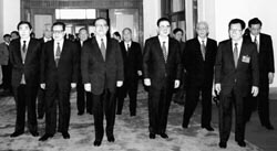 江澤民、李鵬、喬石、朱镕基、劉華清、胡錦濤、尉健行、李嵐清、榮毅仁等同志到會祝賀全國政協(xié)九屆一次會議開幕,并在主席臺上就座。