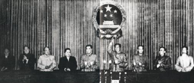 1954年9月15日至28日,第一屆全國人民代表大會(huì)第一次會(huì)議在京召開,大會(huì)通過了《中華人民共和國憲法》。圖為大會(huì)主席臺(tái)。左起:陳叔通、黃炎培、李濟(jì)深、宋慶齡、周恩來、毛澤東、劉少奇、郭沫若、張瀾。
