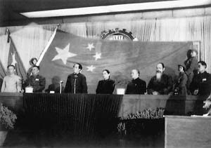 10月1日,中央人民政府委員會舉行第一次會議,正副主席及委員宣誓就職,成立中央人民政府。首都30萬群眾齊集天安門,隆重舉行慶祝新中國的開國大典。