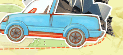 圖為蠟筆畫。中國(guó)館為俯瞰圖。底色為兩階,下為充滿生機(jī)的綠色草地,上為藍(lán)波蕩漾的河水。