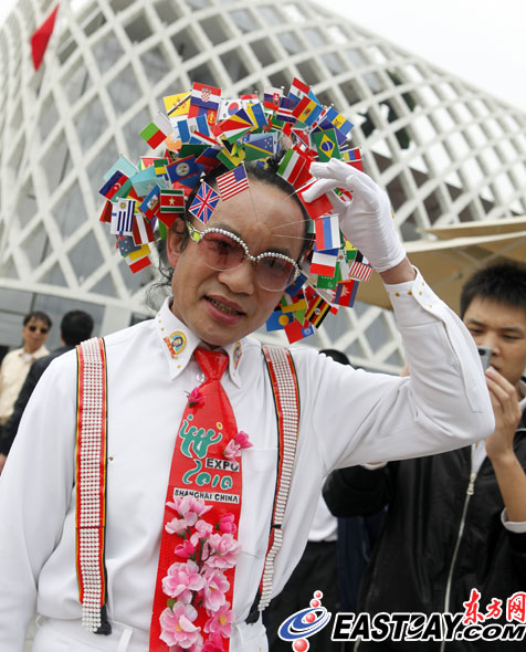 精彩紛呈的世博會(huì),吸引了八方游客前來觀展。穿梭在展館之間的行為藝術(shù)表演,也是觀眾不容錯(cuò)過的節(jié)目。更有觀眾自發(fā)上陣,支持世博,堪稱一絕。圖為有廣西人奇人之稱的韋盛初,頭上插滿世博旗幟的銀針,支持世博。(記者 劉歆/攝)