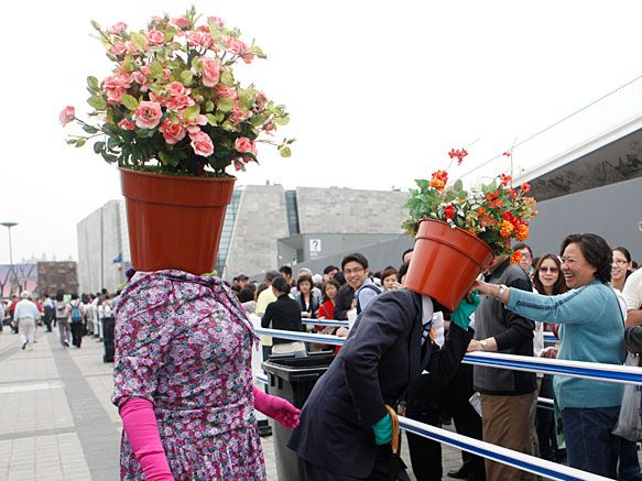 精彩紛呈的世博會(huì),吸引了八方游客前來觀展。穿梭在展館之間的行為藝術(shù)表演,也是觀眾不容錯(cuò)過的節(jié)目。更有觀眾自發(fā)上陣,支持世博,堪稱一絕。圖為在德國館前,行為藝術(shù)表演者吸引眾多觀眾駐足觀賞。(記者 劉歆/攝)