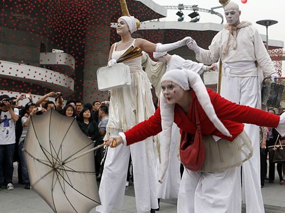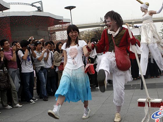 精彩紛呈的世博會(huì),吸引了八方游客前來觀展。穿梭在展館之間的行為藝術(shù)表演,也是觀眾不容錯(cuò)過的節(jié)目。更有觀眾自發(fā)上陣,支持世博,堪稱一絕。圖為在德國館前,行為藝術(shù)表演者吸引眾多觀眾駐足觀賞。(記者:劉歆?攝)