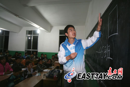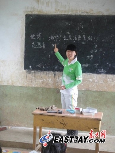 志愿者帶去了自費(fèi)4000多元買的文具,看到一位孩子,就給他一份。支教的同學(xué)大部分也是世博志愿者。在課堂上,他們教授語文、音樂、禮儀、世博、英語、手工等10門課。在世博課上,他們告訴孩子世博會背景,介紹世博會熱門場館,為了給孩子們更直觀的感受,他們用筆記本電腦,通過圖片和視頻向他們演示。馬澤在上課的時(shí)候,讓學(xué)生們大聲地喊出世博會口號,他說:“這些孩子的情感一直都被壓抑著,我讓他們大聲喊出來,把壓抑釋放出來!敝驹刚呱险n的教室門外邊總是站滿了村民。