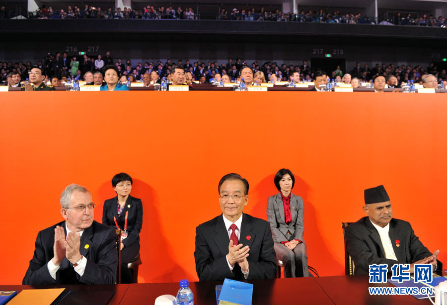 10月31日晚,中國2010年上海世博會閉幕式在世博文化中心舉行。這是中國國務(wù)院總理溫家寶同中外嘉賓在主席臺就座。 新華社記者黃敬文攝