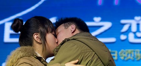 昨日,上海靜安體育館,一對(duì)男女在“白色情人節(jié)”相親會(huì)上當(dāng)眾表白后擁吻。早報(bào)記者 魯海濤 圖