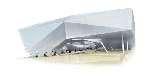 展示在我們眼前的是一個(gè)由透明的銀色發(fā)光建筑膜包裹的建筑體,它漂浮于幾根支撐結(jié)構(gòu)上,怎么看,都像是一座可漫步其間的三維空間體雕塑。起落有致的坡型景區(qū)從底層向